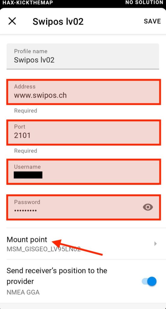 Enter a personal profile name then fill in the address, port, username and password that were provided to you when you purchased your RTK correction subscription. Then press “mount point” and select the desired data stream.